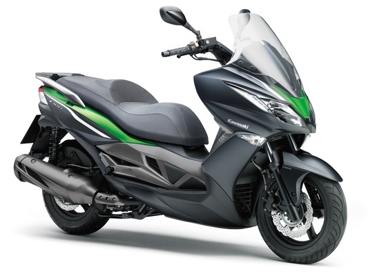 Kawasaki J300 — одна из самых ожидаемых премьер мотовыставки EICMA 2013, которая открылась вчера в Милане. Дело в том, что японский производитель впервые разработал достойный скутер специально для европейских покупателей. Конечно, не стоит забывать, что скутер Kawasaki J300 разрабатывался в тесном сорудничестве с тайваньским изготовителем Kymco, который поставляет двигатели для скутера: 299 см3, жидкостное охлаждение, 1-цилиндровый, мощность 29.5 л.с. и крутящий момент 25 Нм. Таким же силовым агрегатом комплектуются скутеры Kymco Downtown 300i. Несмотря на некоторые общие черты с Kymco, скутер J300 обладает характером Kawasaki, который прослеживается в дизайне и комплектации: агрессивный обтекатель, дизайн передних фар в стиле Kawasaki Ninja, светодиодные поворотники, задние фонари и т.п. Скутер оснащается 37-мм телескопической вилкой и регулируемыми (преднатяг) задними амортизаторами с 5 опциями настройки. По словам Kawasaki подвеска настроена для спортивного и агрессивного стиля езды, а место для ног спроектировано так, чтобы скутер J300 можно было закладывать немного больше, чем позволяют традиционные скутеры других производителей.